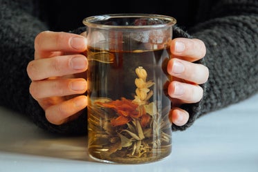 Als er voldoende water in je glas zit, kun je de theebloem er voorzichtig in laten vallen. Na 3 tot 5 minuten zal deze volledig zijn opengevouwen.