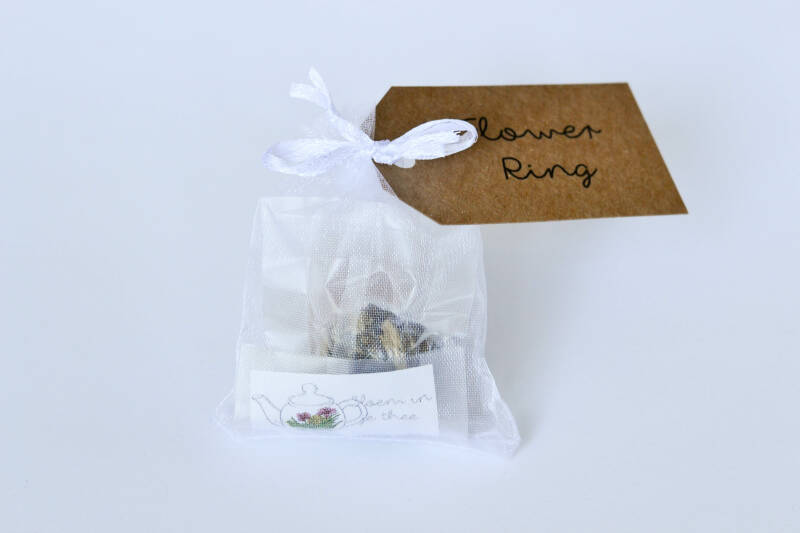 De theebloem is per stuk vacuüm verpakt, dit voor een lange houdbaarheid. Op de theebloem zit een sticker met het logo van 'Bloem in je thee', de achterkant van de theebloem is leeg.